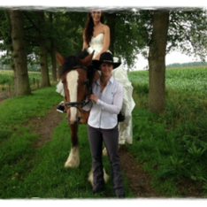 Deze reactie is van Anita die, toen ze contact met mij opnam, haar paard nauwelijks uit het weiland durfde te halen. Ze wilde er graag aan werken om op hem naar haar eigen bruiloft te rijden. Zoals je op de foto ziet is dat gelukt!